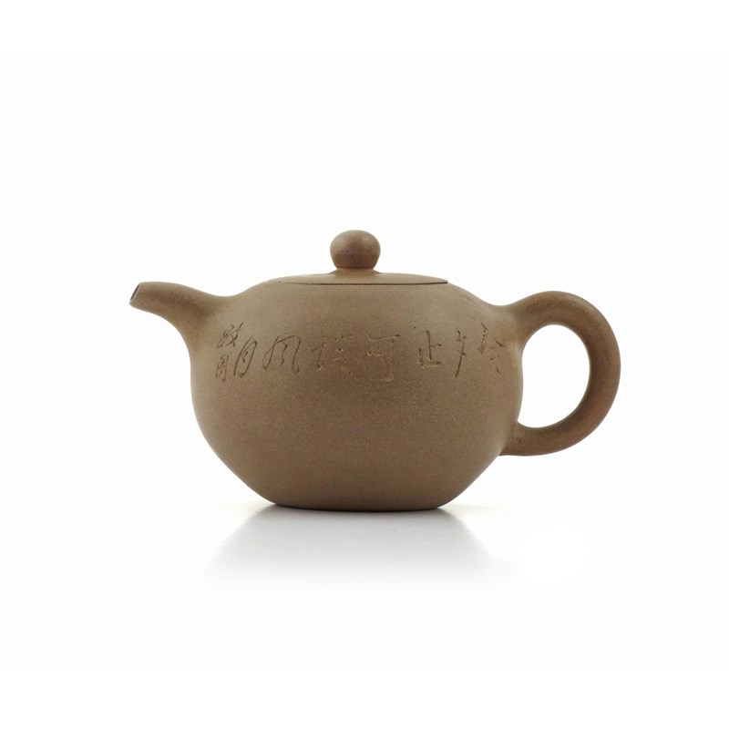 A Chinese Yixing teapot and cover 20th century, the duanni body of compressed circular form, inscribed to one side with a poem by Zhi Tao, the cover marked huo xi, 17.5cm. (2)
