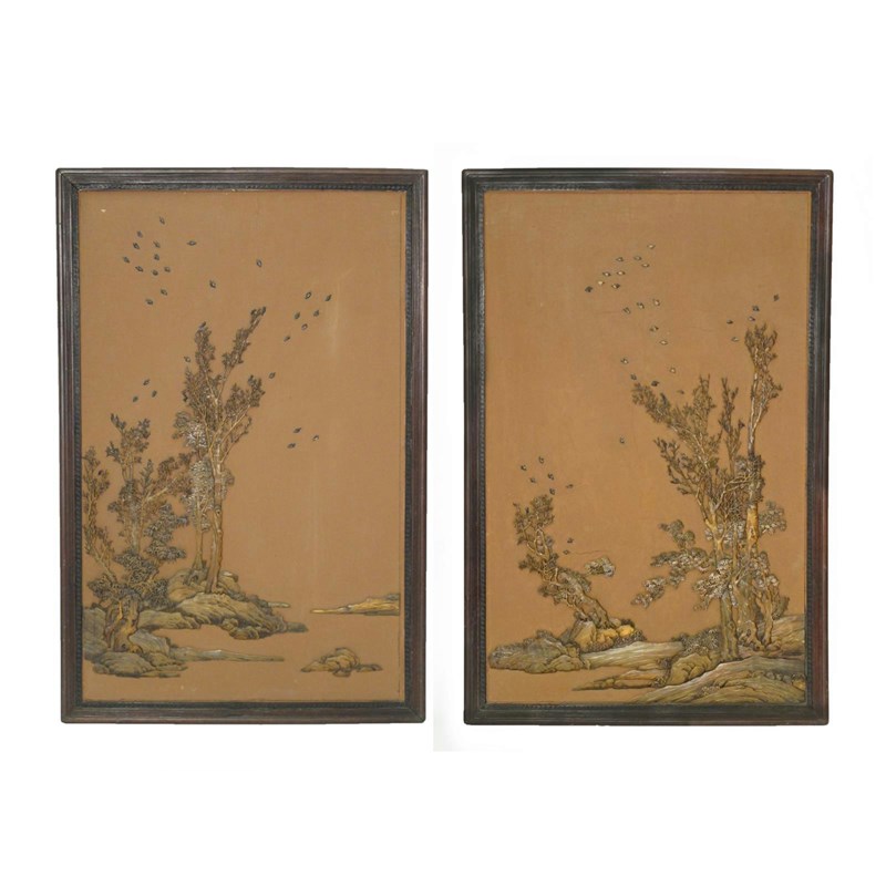 A rare pair of Chinese Imperial wall panels 19th century, each decorated in buffalo horn, carved in shallow relief with tall trees and leafy maple on small rocky islands, with flocks of small birds flying to roost in the treetops, all on a brown lacquer ground and mounted within zitan and hardwood frames, 99.5cm x 66cm overall. (2)