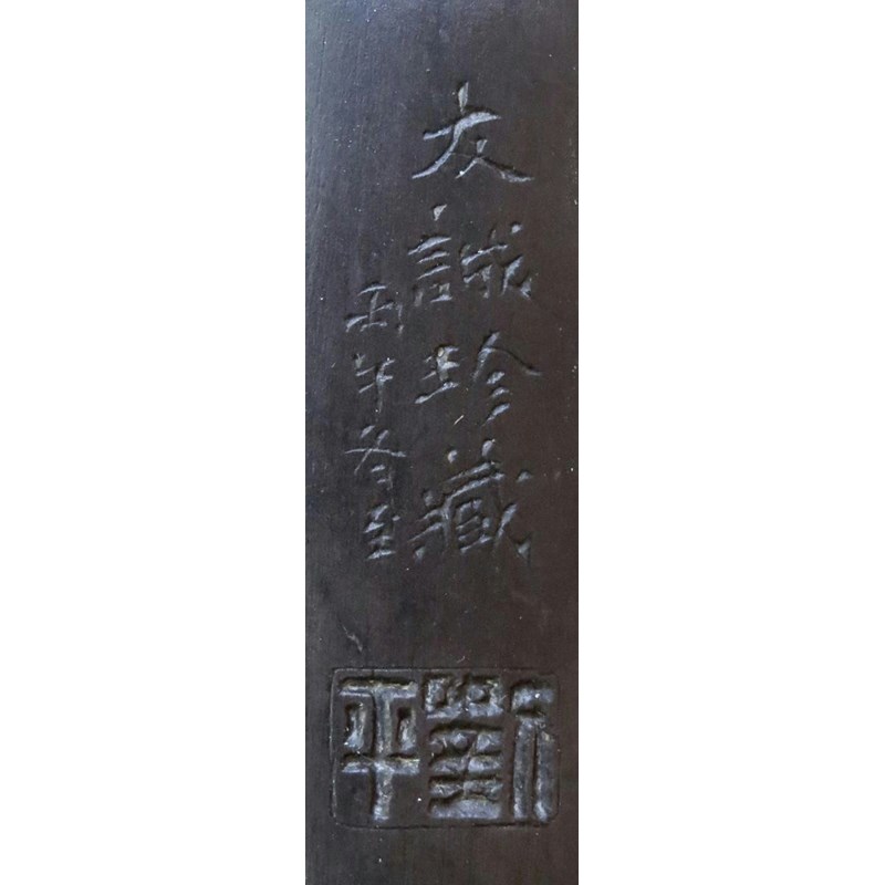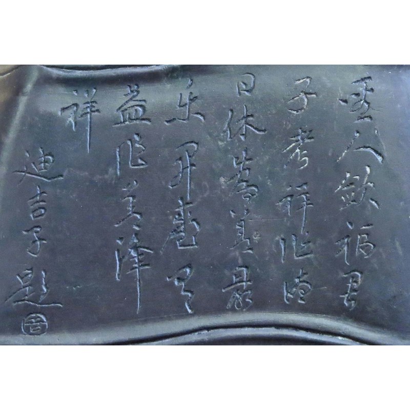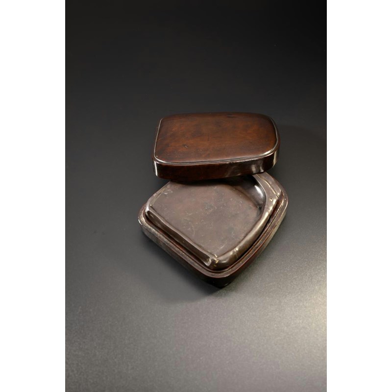 A Chinese duan ink stone 19th/20th century, simulating a cross-section of bamboo, the reverse with a poem by Di Ji Zi, and an accompanying seal which reads Ji, an inscription to one side which reads you cheng zhen cang, together with a seal which reads xin ping, contained in a fitted hardwood box and cover, 9cm. (3)