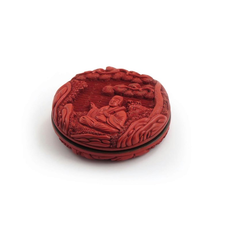 A small Chinese red cinnabar lacquer circular box and cover 18th/19th century, carved in relief with a standing scholar holding a fly whisk, the reverse with a man seated and holding a fan, 5.1cm. (2)