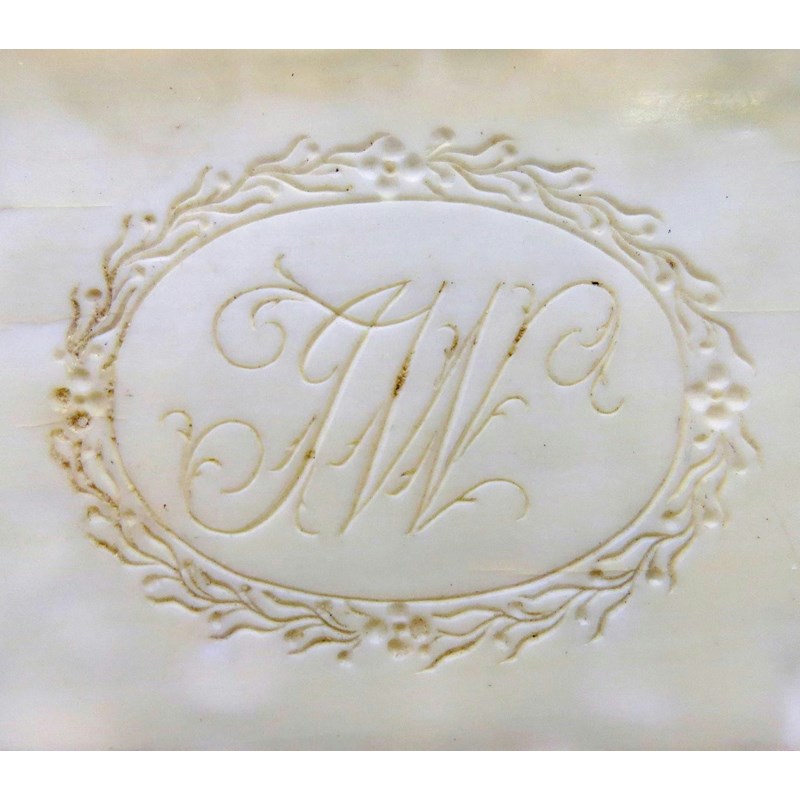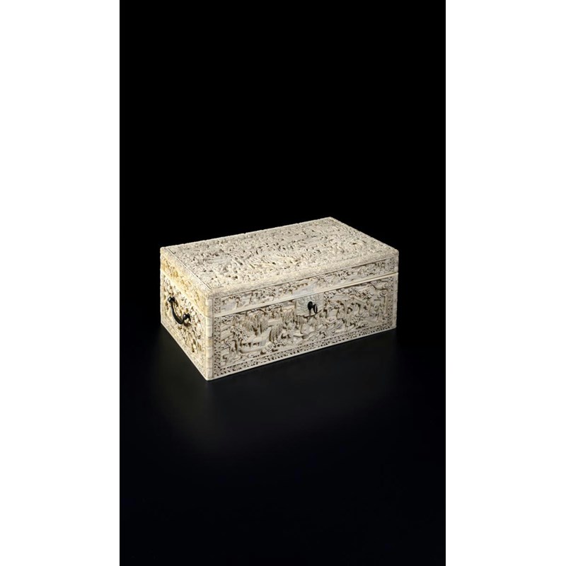 λ A fine Chinese Canton ivory rectangular sewing box c.1800, with a removable compartmentalised tray containing various implements, the hinged cover intricately carved in relief with many figures engaged in daily life, with pagodas, river boats and bridges amidst pine, prunus and willow, all within an elaborate foliate border, the underneath with a cartouche containing the monogram 'I W', a loose metal handle to each end, 28.1cm. (3)