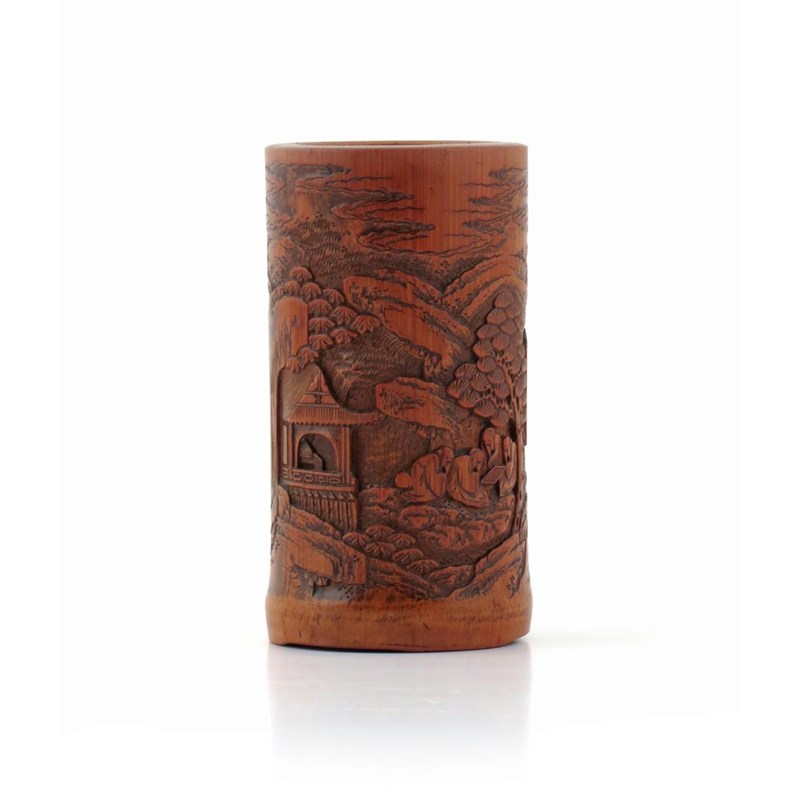 A Chinese bamboo bitong 18th/19th century, the cylindrical body raised on three low feet, carved in relief with four figures playing go beneath a pine tree, a pagoda, further trees and rockwork to one side, 11.8cm.
