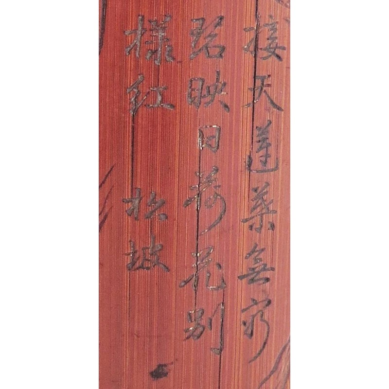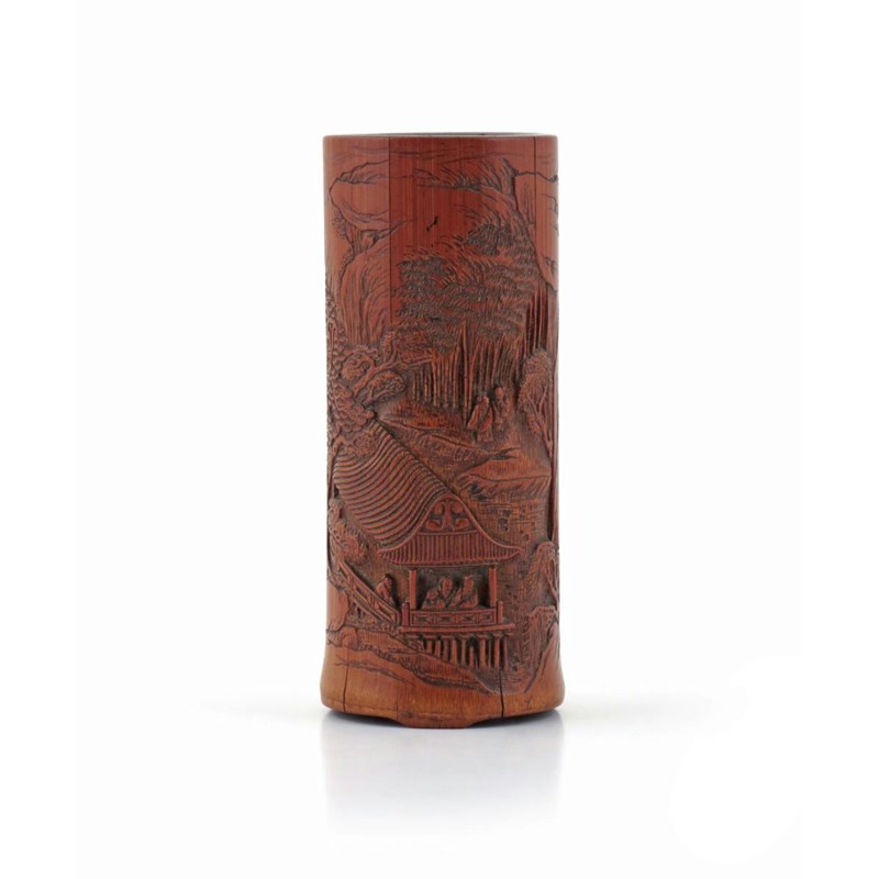 A small Chinese bamboo bitong 18th/19th century, the cylindrical body raised on three short feet, finely carved in shallow relief with figures in a pagoda beneath a pine tree, with craggy rocks and further figures in a bamboo grove beyond, the reverse with two phrases of a poem by Yang Wan Li, 11.7cm.