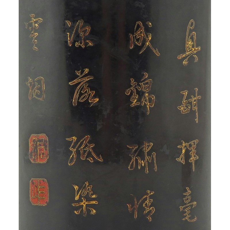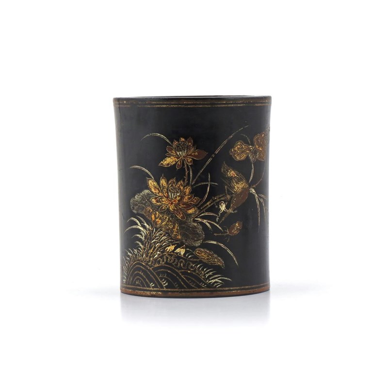 A Chinese black lacquer bitong probably Kangxi, decorated in gilt with a kingfisher catching a small frog whilst perched on a lotus flower stem, the reverse with calligraphy and two seal marks, 13.7cm.