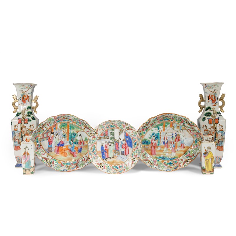 FOUR CHINESE CANTON FAMILLE ROSE VASES AND THREE DISHES 19TH CENTURY Comprising: a pair of large...