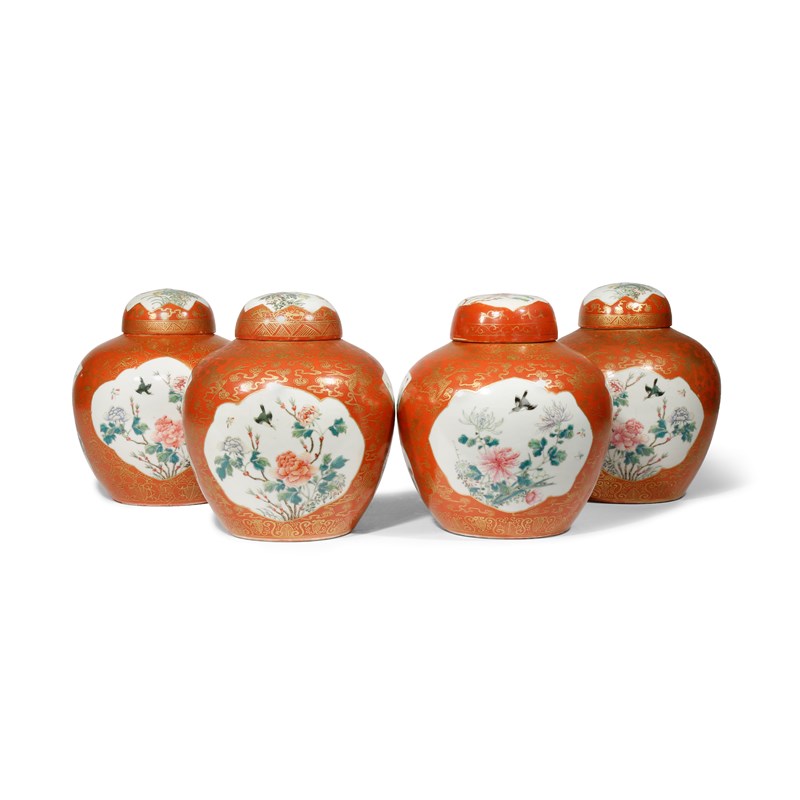 FOUR CHINESE FAMILLE ROSE OVOID JARS AND COVERS 19TH CENTURY Each with shaped cartouches...