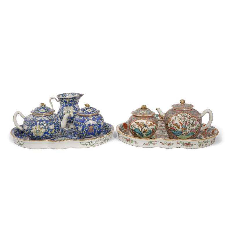 TWO CHINESE ENAMELLED PART CABARET SETS 19TH CENTURY Comprising: two teapots and covers