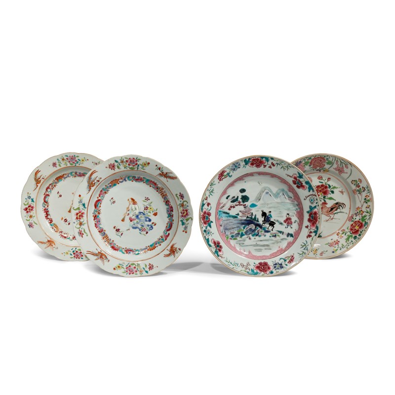 FOUR CHINESE FAMILLE ROSE DISHES QIANLONG 1736-95 Two a pair painted with a European man seated...