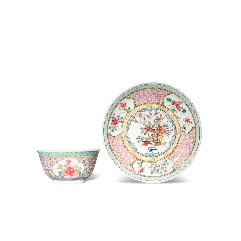 A CHINESE FAMILLE ROSE TEA BOWL AND SAUCER YONGZHENG 1723-35 Brightly decorated with cartouches...