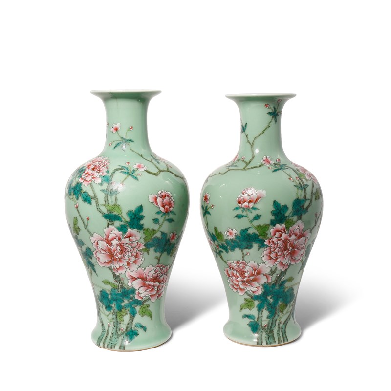 A PAIR OF CHINESE FAMILLE ROSE CELADON-GROUND VASES