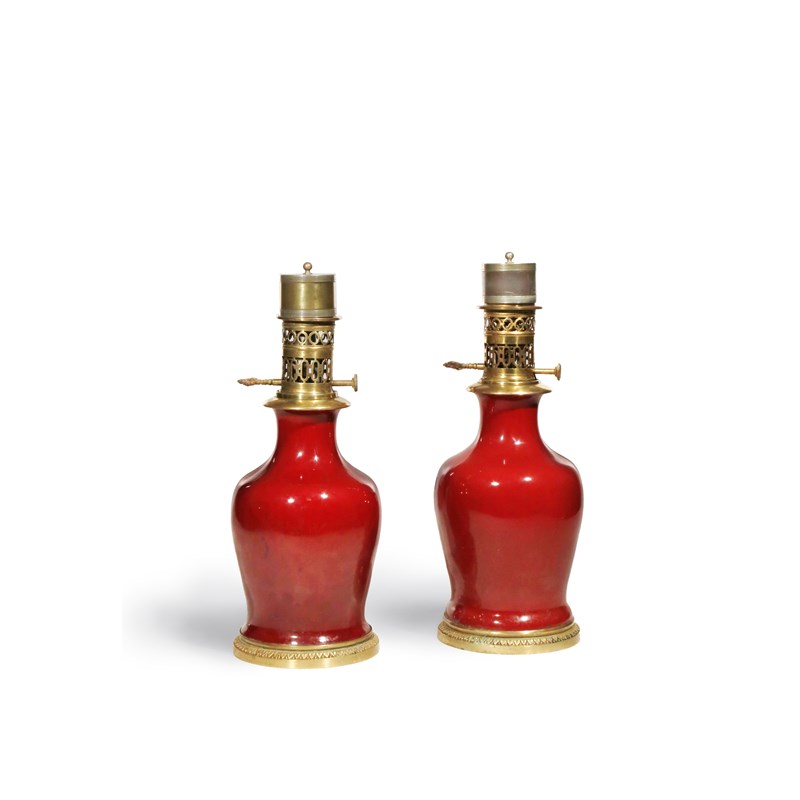 With ovoid bodies and flaring necks, mounted as lamps, decorated with an even sang de boeuf glaze, 39cm. (4)