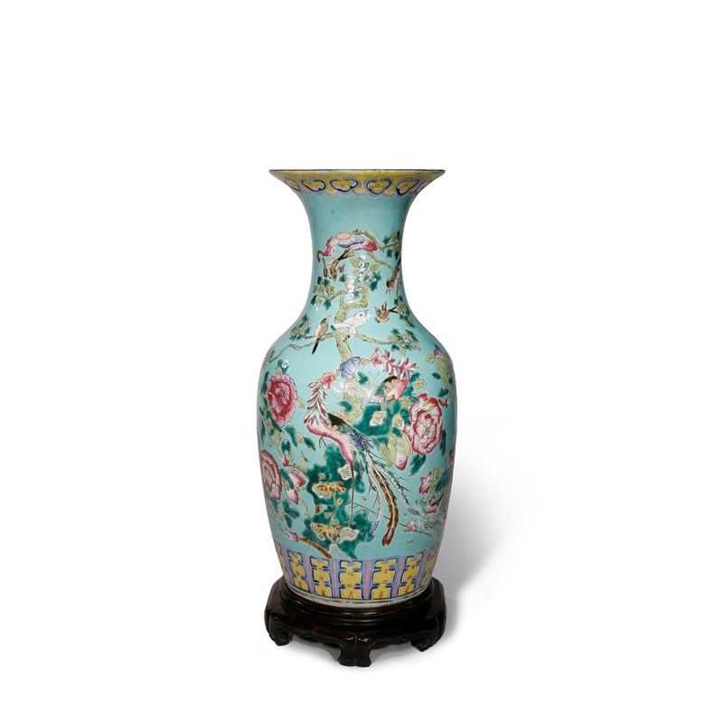 A CHINESE FAMILLE ROSE TURQUOISE-GROUND VASE 19TH CENTURY The ovoid body rising to a flared neck