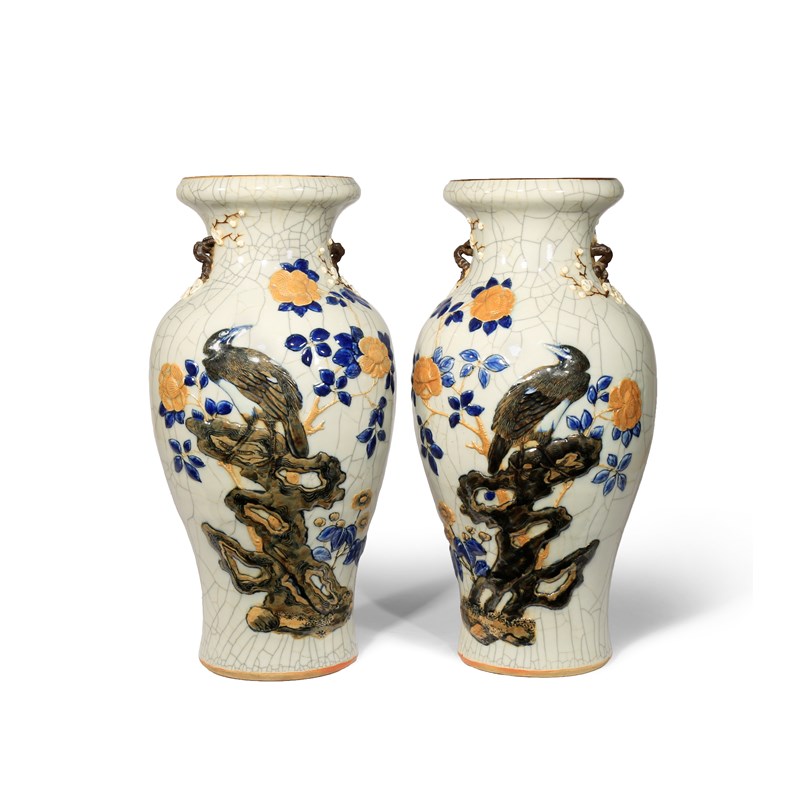 A PAIR OF CHINESE CRACKLE GLAZED BALUSTER VASES LATE QING DYNASTY Moulded in relief with birds...