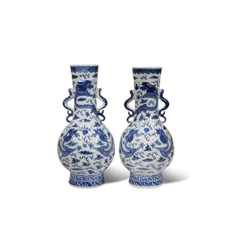 Each painted with three scaly dragons in pursuit of sacred jewels amidst stylised flames and clouds, the tall necks flanked by two handles formed as sinuous dragons, the foot of each decorated with breaking waves, with six character Qianlong marks to the bases, 40.5cm. (2)