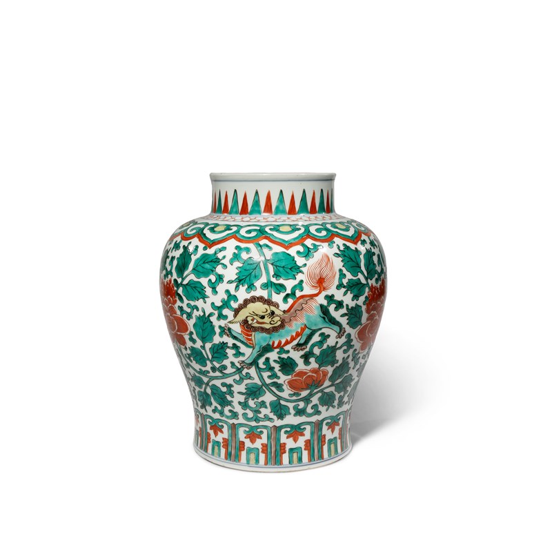 Painted in coloured enamels with three lion dogs set against scrolling flowerheads and foliage, with a broad band of ruyi-heads and a cracked-ice border to the shoulder, 30cm.