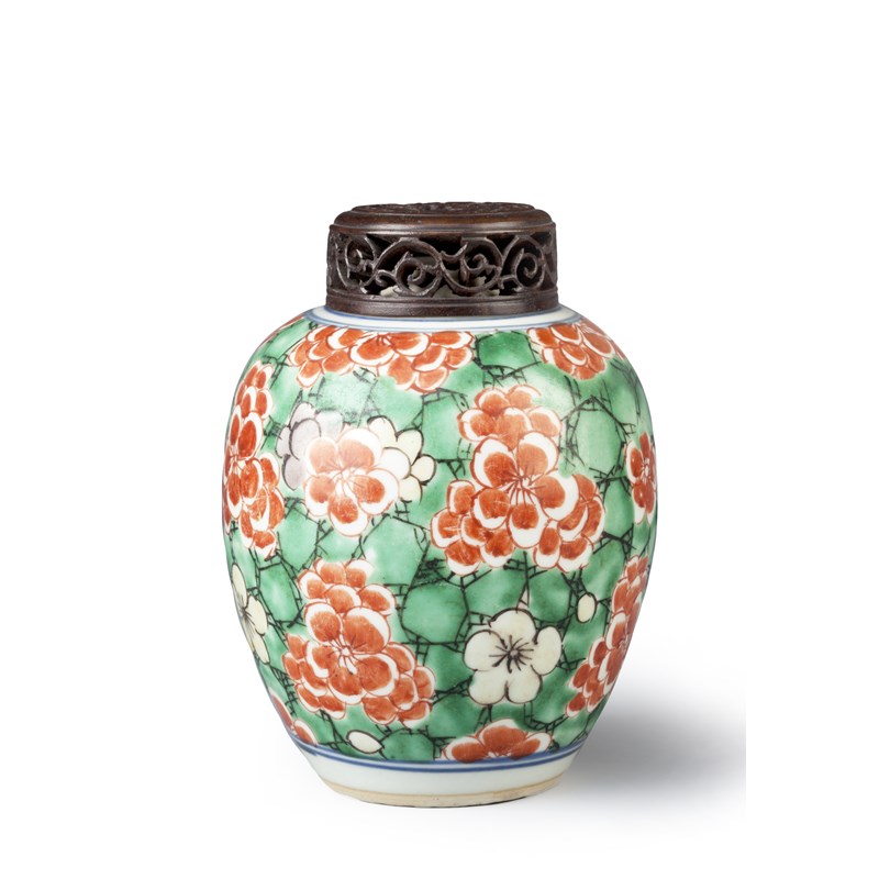 The ovoid body painted in iron-red, aubergine and yellow enamels with prunus on a green cracked-ice ground, together with a reticulated wood cover, 12cm. (2)