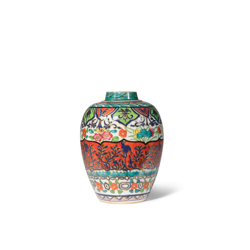 Brightly painted in enamels and gilt with flowers, scrolling foliage, birds, shaped cartouches and geometric patterns, with bands of stylised waves to the rim and shoulder, a lingzhi mark to the base, 16.4cm.