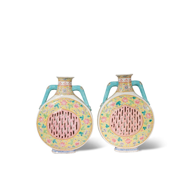 A PAIR OF CHINESE FAMILLE ROSE RETICULATED MOONFLASKS
