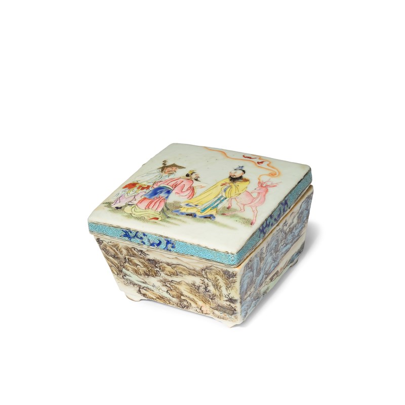 A CHINESE FAMILLE ROSE AND POLYCHROME SQUARE INK BOX AND COVER YONGZHENG 1723-35 The cover...