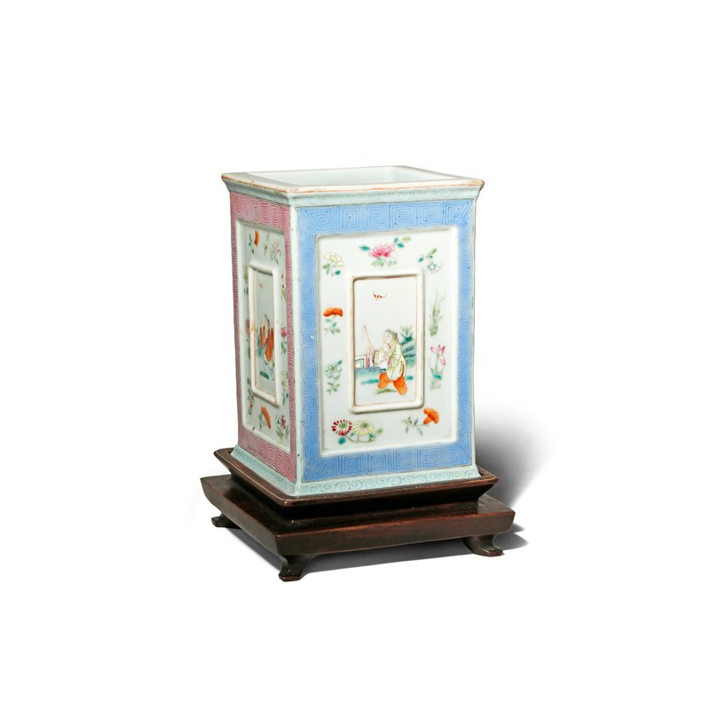 A CHINESE FAMILLE ROSE SQUARE-SECTION BITONG LATE QING DYNASTY Each side with a panel depicting a...