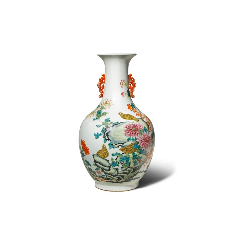 A CHINESE FAMILLE ROSE VASE 20TH CENTURY Painted with butterflies and quails amongst flowers and...