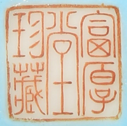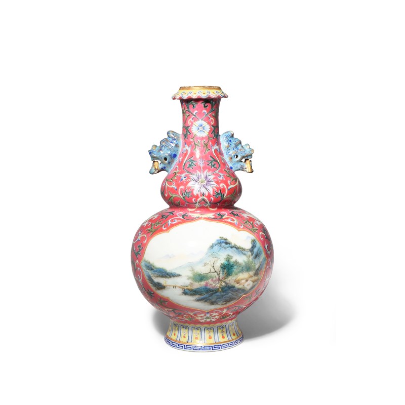 With a gourd-shaped body supported on a flared foot, painted with two shaped cartouches enclosing scenes of figures and houses in a landscape, each with a seal mark, all reserved on a pink floral-decorated ground, the base with a five character mark reading Fu Hou Tang zhen cang, 22.7cm.