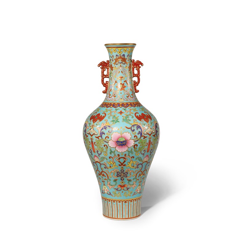 A CHINESE FAMILLE ROSE CLOISONNE-STYLE TURQUOISE-GROUND VASE MODERN Brightly painted with lotus