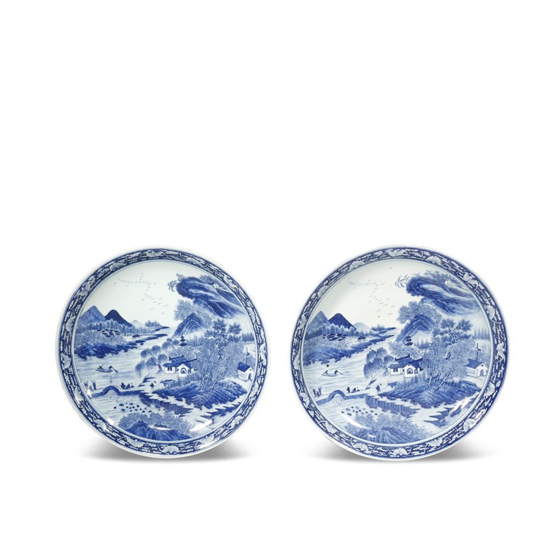 A PAIR OF CHINESE BLUE AND WHITE 'LANDSCAPE' DISHES 19TH CENTURY Each painted to the centre with...