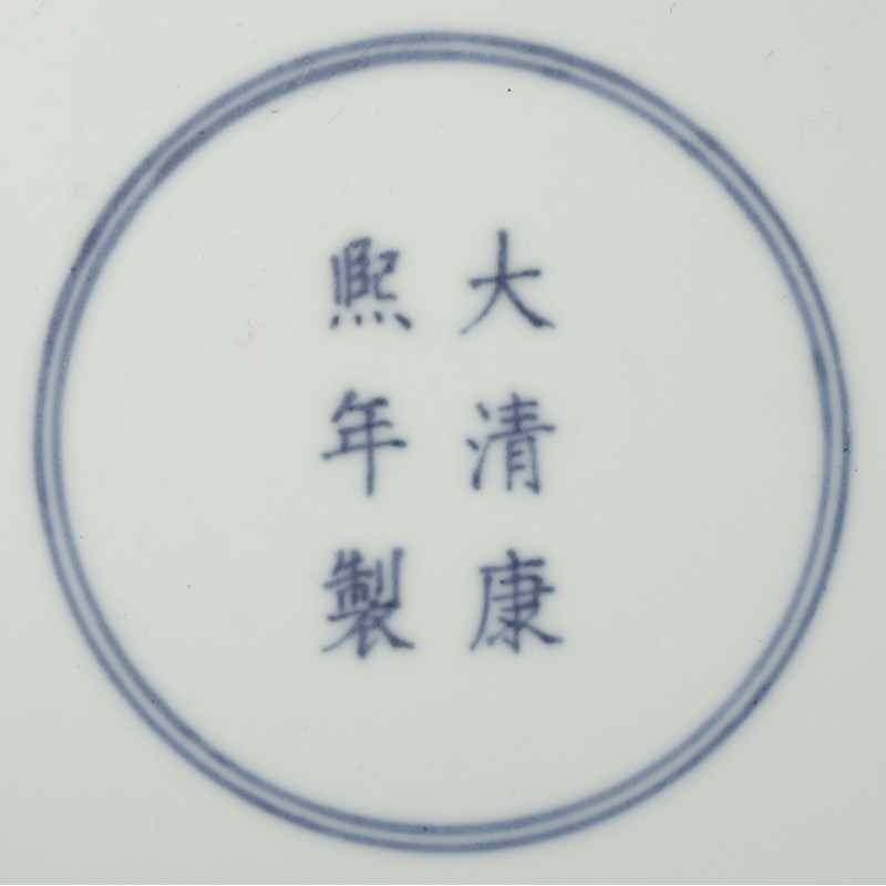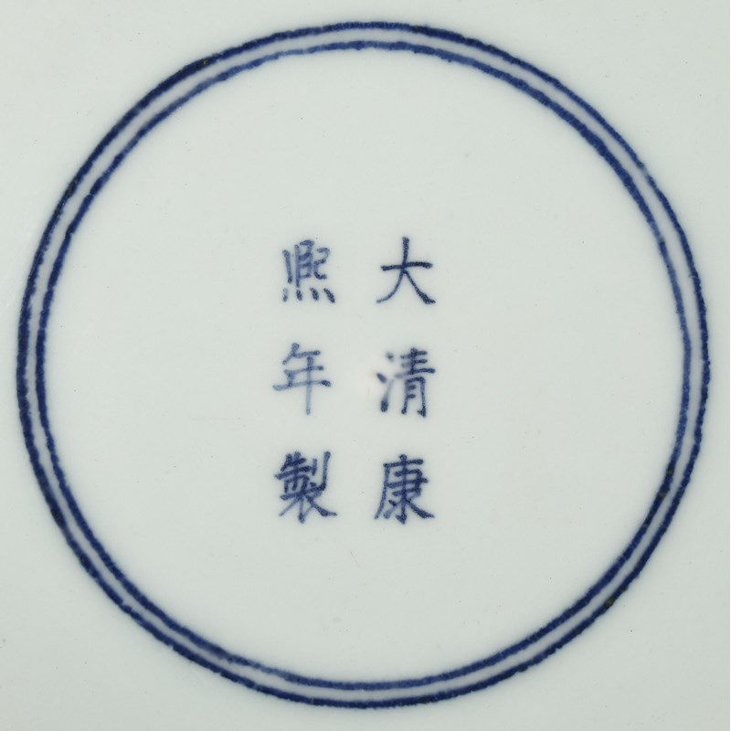 Each painted to the centre with scenes of figures engaged in agricultural work in a rural landscape, with farmhouses and pagodas dispersed amongst the trees and mountains, the rims decorated with bands of bats amidst stylised clouds, with sprays of lotus to the underside of each, the bases with six character Kangxi marks, 34cm. (2)