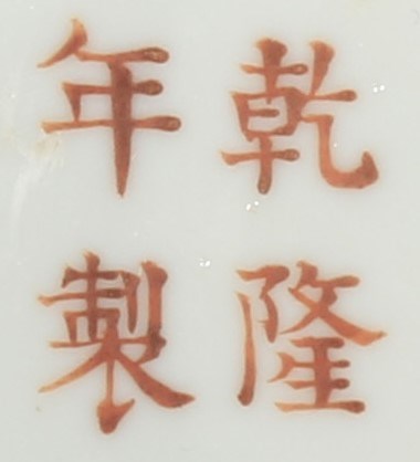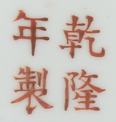 Each with a U-shaped body rising from a short straight foot to an everted rim, finely painted with stylised phoenix in flight amidst blossoming flowers and scrolling foliage, with four character Qianlong marks to the bases, each with a wood stand, 15.3cm. (4)