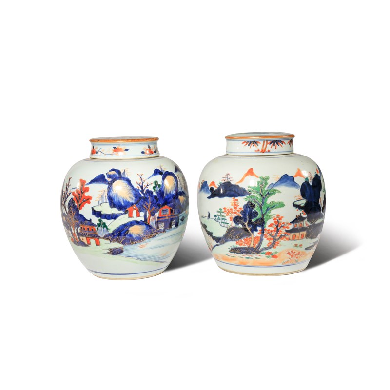A NEAR PAIR OF CHINESE IMARI OVOID VASES AND COVERS KANGXI 1662-1722 The body of each painted in...