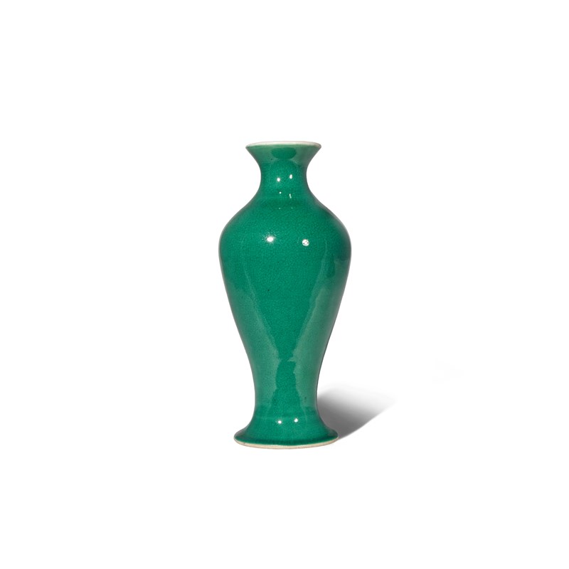 A SMALL CHINESE GREEN CRACKLE GLAZED VASE LATE QING DYNASTY/REPUBLIC PERIOD The ovoid body rising...