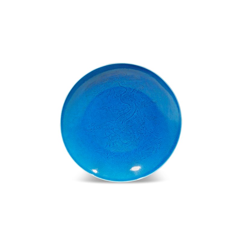 A CHINESE TURQUOISE CRACKLE GLAZED 'DRAGON' DISH QING DYNASTY OR LATER All covered with a bright...