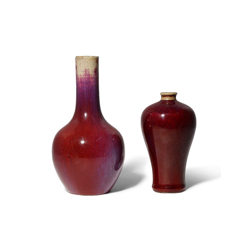 One a bottle vase, the other a meiping, each coated in a rich maroon glaze with streaks and flecks of lavender and orange, the glaze thinning to a pale brown at the mouth rims, 20.6cm. (2)