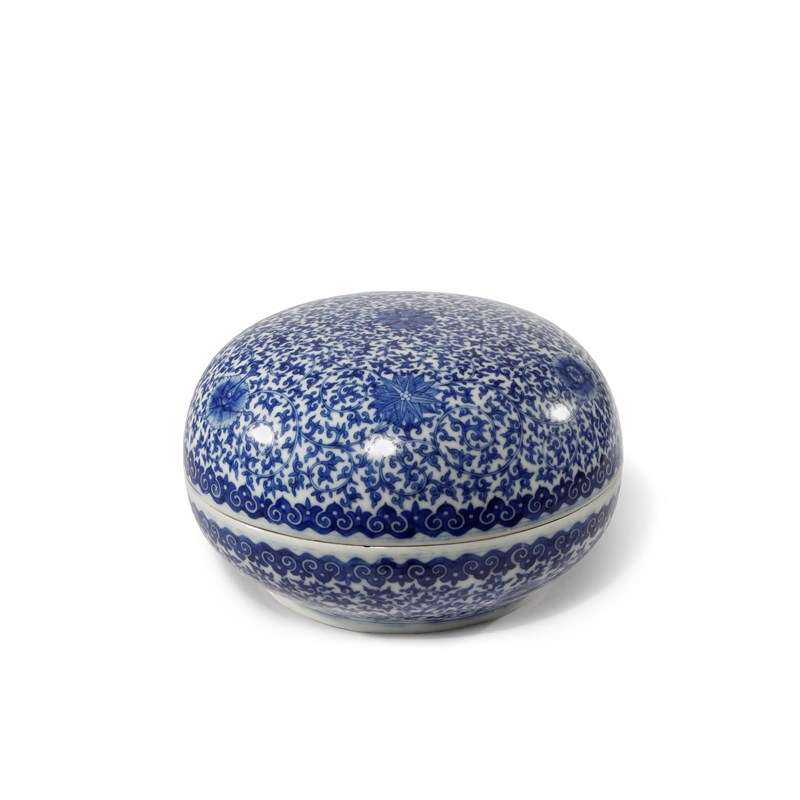 A CHINESE BLUE AND WHITE CIRCULAR BOX AND COVER 19TH CENTURY Painted with flowerheads and...