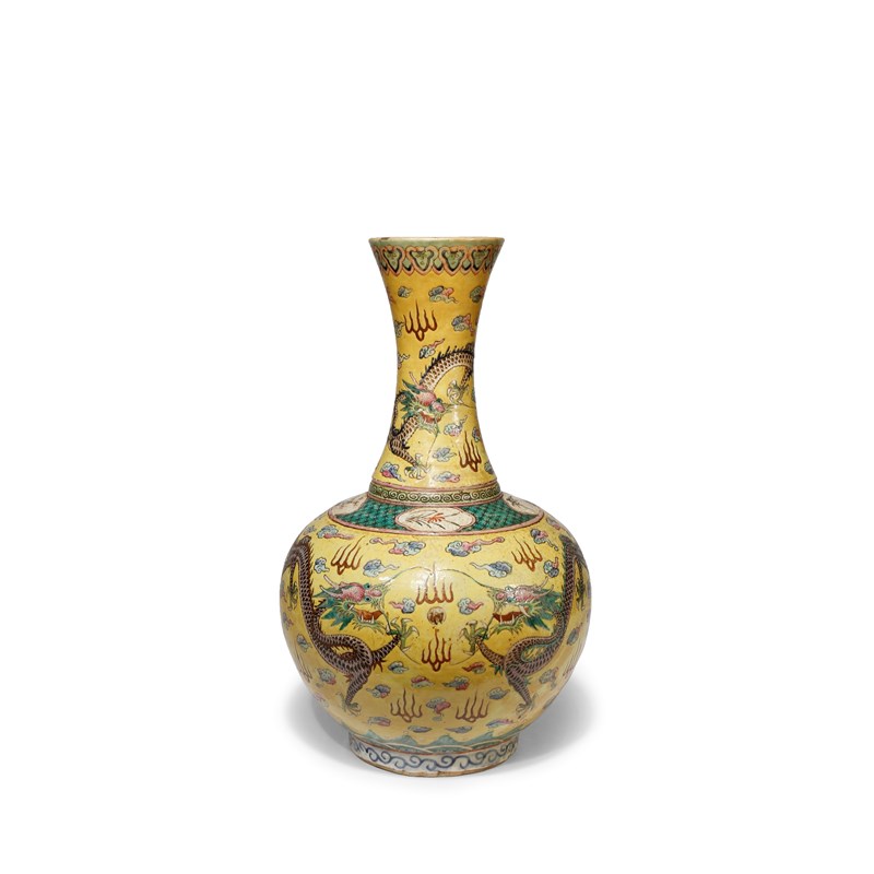 Painted with the mythical beasts in pursuit of a sacred jewel amidst stylised flames and clouds, all on a yellow ground, the shoulder decorated with four cartouches enclosing floral and foliate sprays against a green diaper pattern, with a band of ruyi-heads to the rim, 39cm.