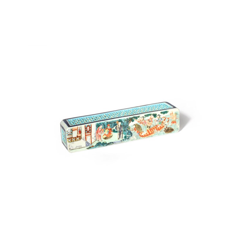 The square-section rectangular body decorated in enamels and gilt, painted to one facet with a scene of armed ladies and spirits crossing the sea on a raft and advancing towards figures on the shore, the other sides and one end glazed turquoise and with openwork trellis, the other end with an aperture, 20cm.