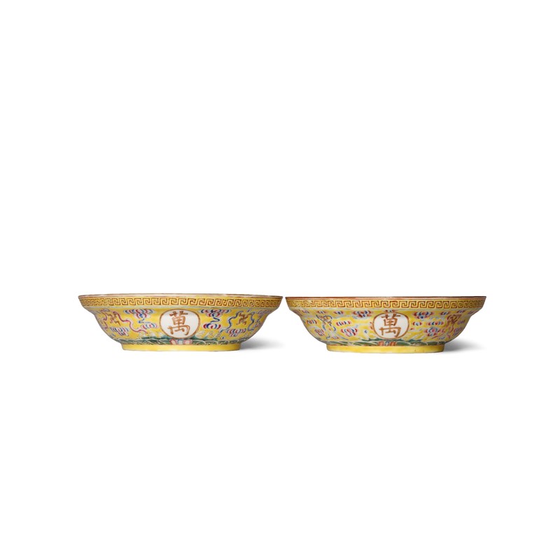 Each painted in enamels and gilt with fylfots and four roundels containing characters above a band of breaking waves, all against a bright yellow ground, the centre of each decorated with five bats encircling a shou character, 16cm. (2)