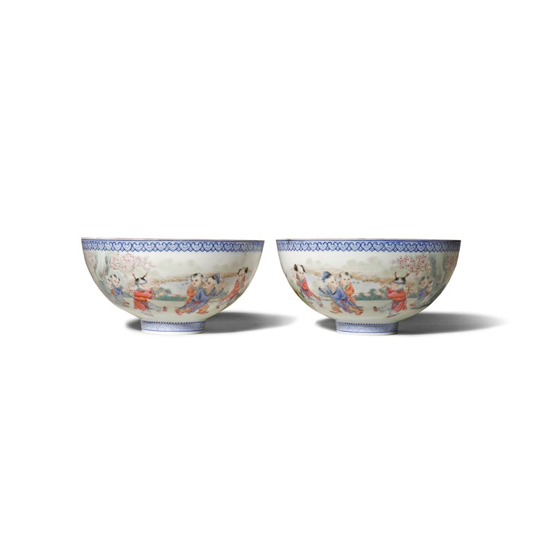 A PAIR OF CHINESE FAMILLE ROSE EGGSHELL PORCELAIN 'BOYS' BOWLS