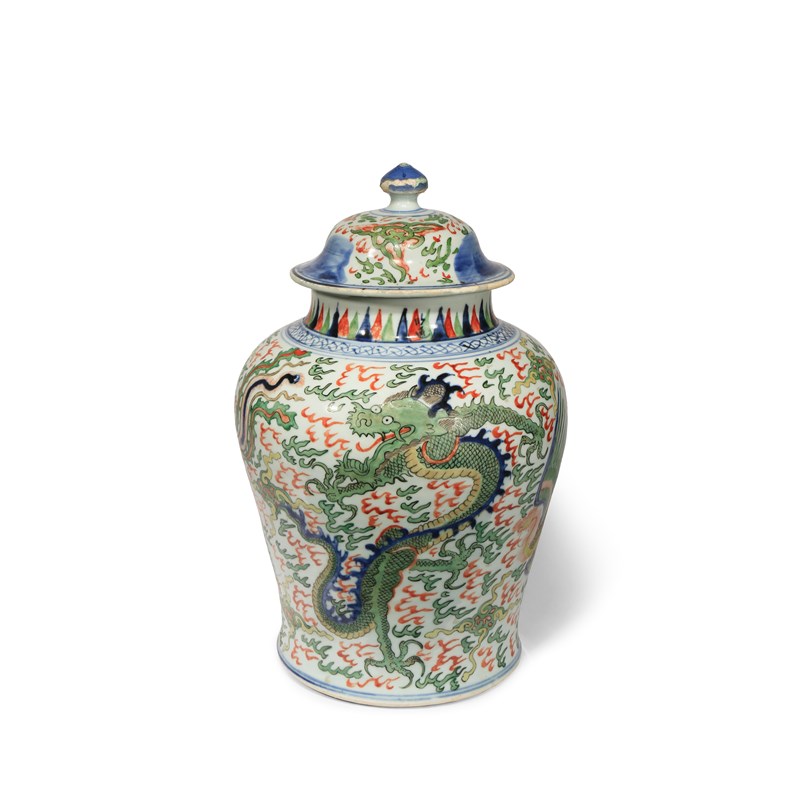 A CHINESE WUCAI 'DRAGON AND PHOENIX' BALUSTER VASE AND COVER PROBABLY 17TH CENTURY Painted with...