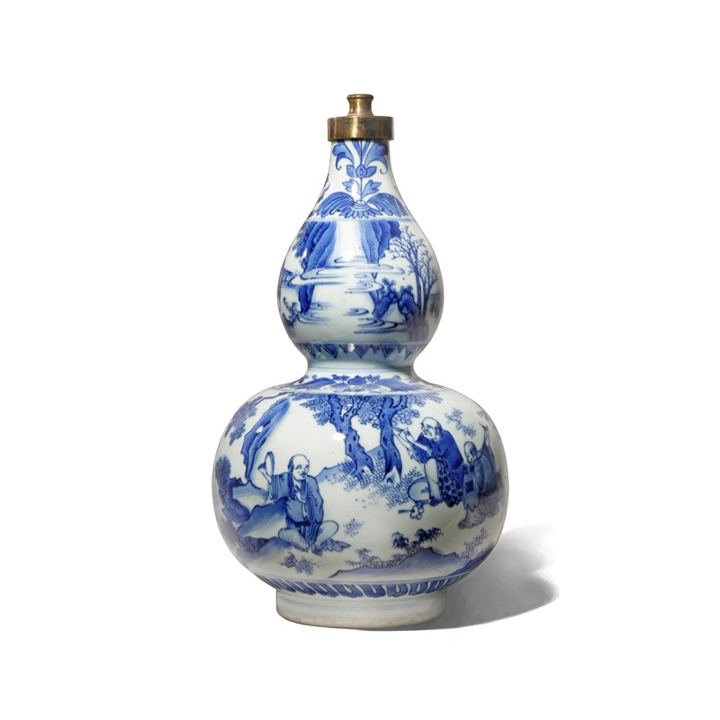 A CHINESE BLUE AND WHITE HULUPING TRANSITIONAL C.1640 Formed in the shape of a gourd