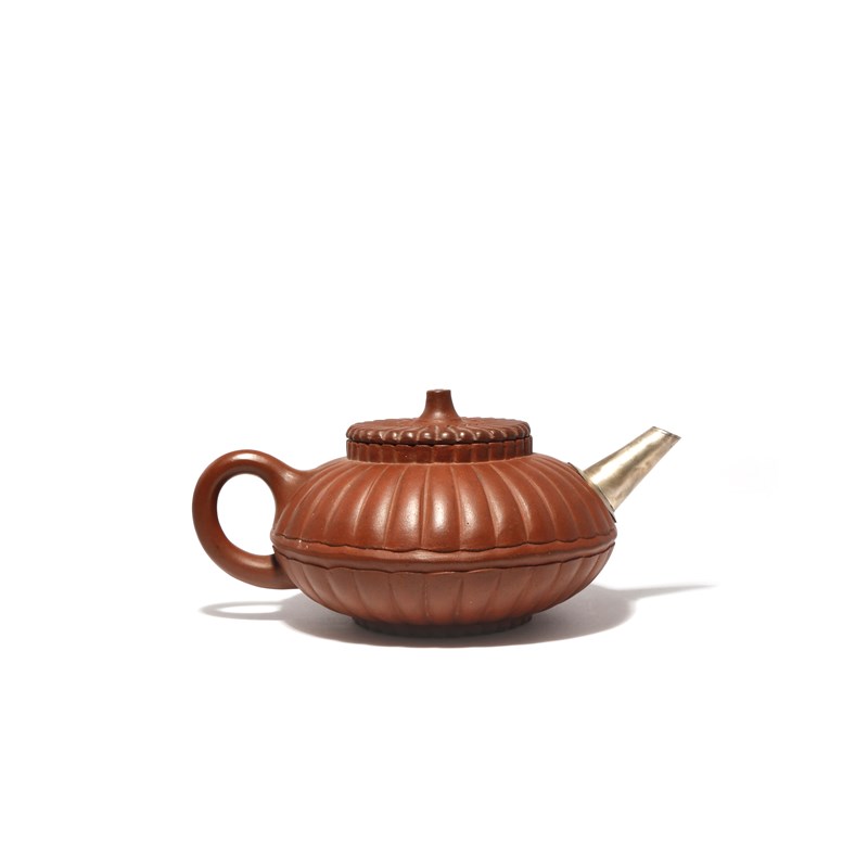 The compressed circular body moulded with many narrow petals, with a loop handle and a metal spout, the flat cover and short foot formed as chrysanthemum flowerheads, surmounted by a short pierced stem finial, 19cm. (2)