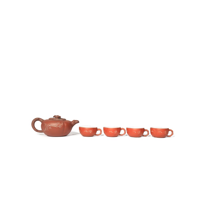 A CHINESE YIXING TEAPOT AND COVER AND A SET OF FOUR CUPS