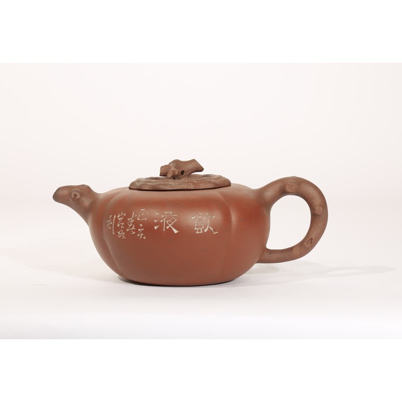 The teapot's compressed body incised with an inscription to one side and decorated with prunus to the other, each of the cups with calligraphy, the spout, knop and handles formed as tree branches, 19.8cm. (6)
