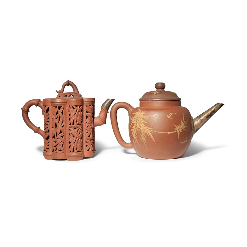 One decorated in slip with bamboo, pine, bats, birds and insects, with a Cun Xing Tang hall mark impressed to the base, the other of flower-shaped section and carved in openwork with bamboo designs, the handle, spout and knop formed as bamboo branches, 18.4cm. (4)