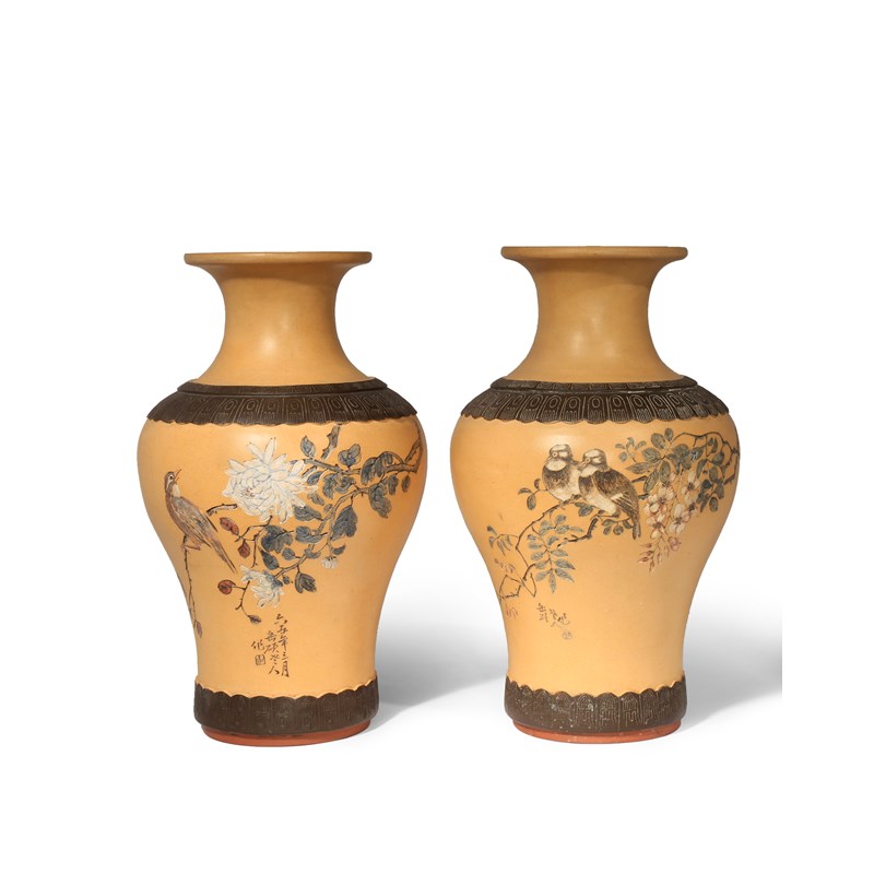 A PAIR OF CHINESE YIXING 'BIRD AND FLOWER' VASES QING DYNASTY One incised and painted with a pair...