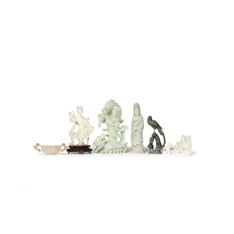 One a jade figure of Guanyin holding a sprig of willow, three further female figures in jadeite and bowenite, the fifth a jade model of two birds, one with a wood stand, the agate cup with lingzhi handles, 24.5cm. (7)