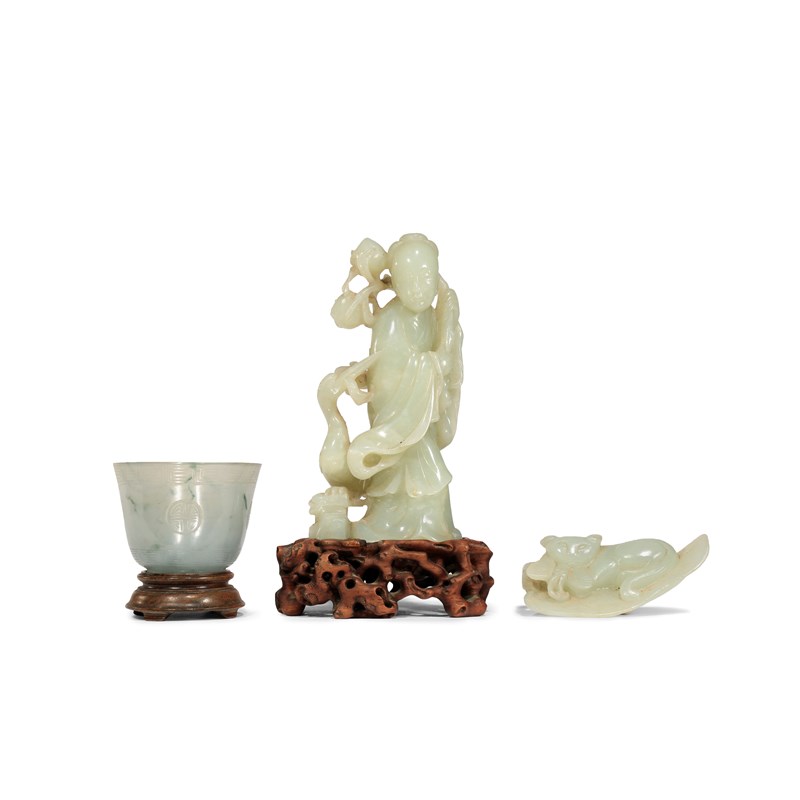 TWO CHINESE PALE CELADON JADE CARVINGS AND AN AGATE CUP QING DYNASTY One carving of a lady...