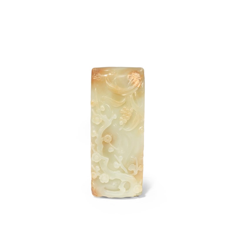 A CHINESE PALE CELADON JADE 'PRUNUS' BRUSH REST QING DYNASTY OR LATER Of rectangular form with...
