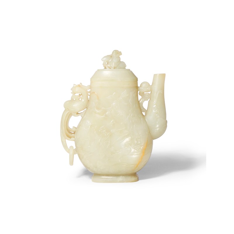 A CHINESE PALE CELADON JADE EWER AND COVER QING DYNASTY OR LATER Carved in shallow relief with...